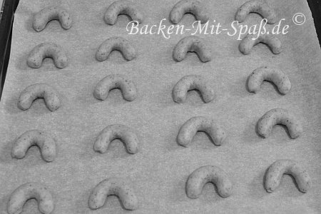 - Aus dem Teig eine ca. 1 cm dicke Rolle formen, in 6- 7 cm lange Stücke schneiden und zu Kipferl formen.